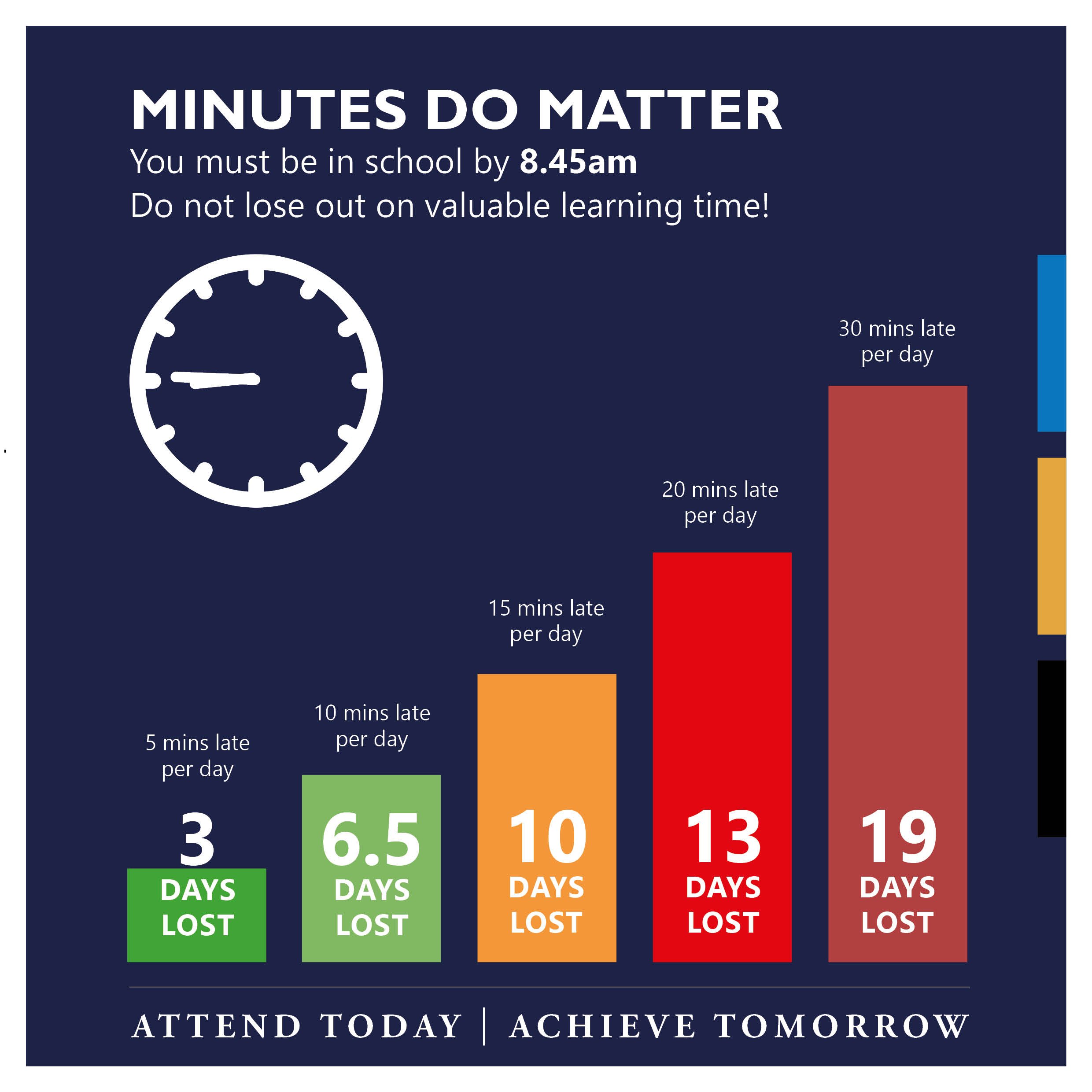 Punctuality to school is a vital component of academic success, as the first few minutes of a lesson often dictate a student’s progress for the lesson and sometimes the rest of the day. When a student arrives late, they miss “retrieval practice” tasks, important instructions and essential support that anchors their learning. Effectively, when late, students are trying to finish a puzzle while missing essential pieces. This does not just affect the individual, it creates a “ripple effect” where the teacher must pause and the entire class loses focus, stealing valuable learning time from everyone. To put the impact in perspective, arriving just 5 minutes late every day results in missing 3 whole days of school by the end of the academic year. This is a gap that becomes increasingly difficult to close as the curriculum progresses.